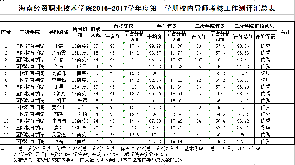 根据《海南经贸职业技术学院校内导师考核及评优工作实施细则》的相关要求和程序,通过导师自评、学生评议、二级学院评议,2016-2017学年度第一学期校内导师考核测评工作已经全部结束,现将考核测评结果予以公示,接受监督。